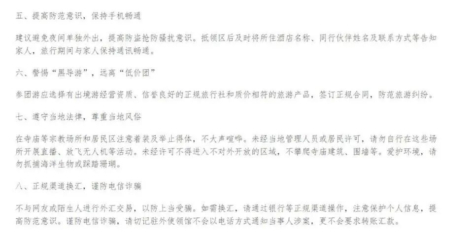“不与网友或生疏东谈主进行外汇交游,以防上当上圈套。如需换汇,请通过银行等正规渠谈操作,矜重保护个东谈主信息,进步防护相识。贯注电信骗取,请切记驻外使领馆不会以电话情势报告当事东谈主涉案,更不会条目转账汇款。”